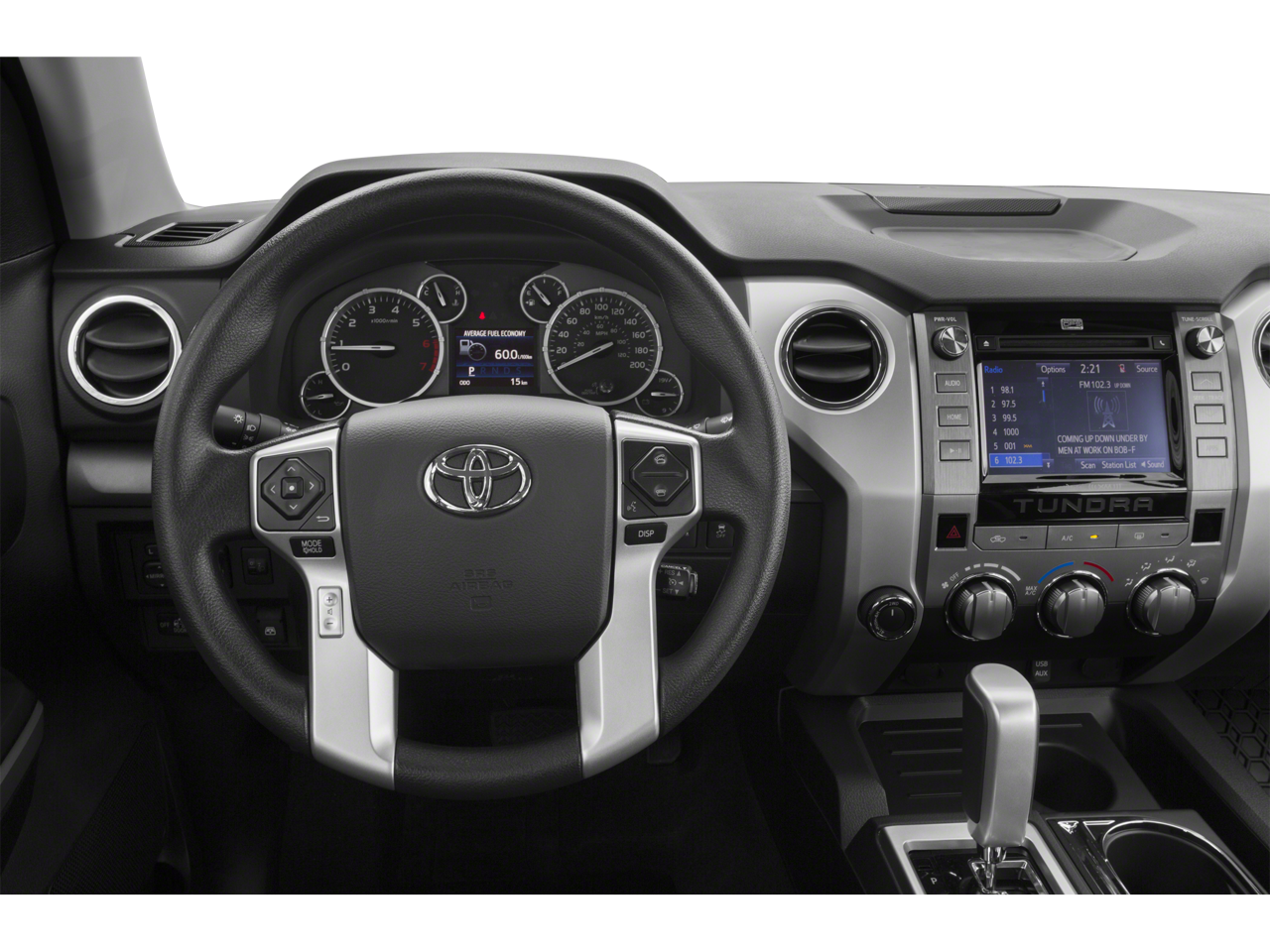 The exterior of this Tundra is finished in a stylish Gray, complemented by the 18-inch aluminum wheels and sleek, modern design. Step inside and you'll find a well-appointed interior with features like an auto-dimming rearview mirror, HomeLink universal transceiver, and 8-way power-adjustable driver's seat with lumbar support.