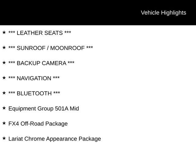 The FX4 Off-Road Package further enhances this truck's versatility, with features like Hill Descent Control, Skid Plates, and Off-Road Tuned Shock Absorbers. Meanwhile, the Lariat Chrome Appearance Package adds a touch of refined style with chrome accents throughout.