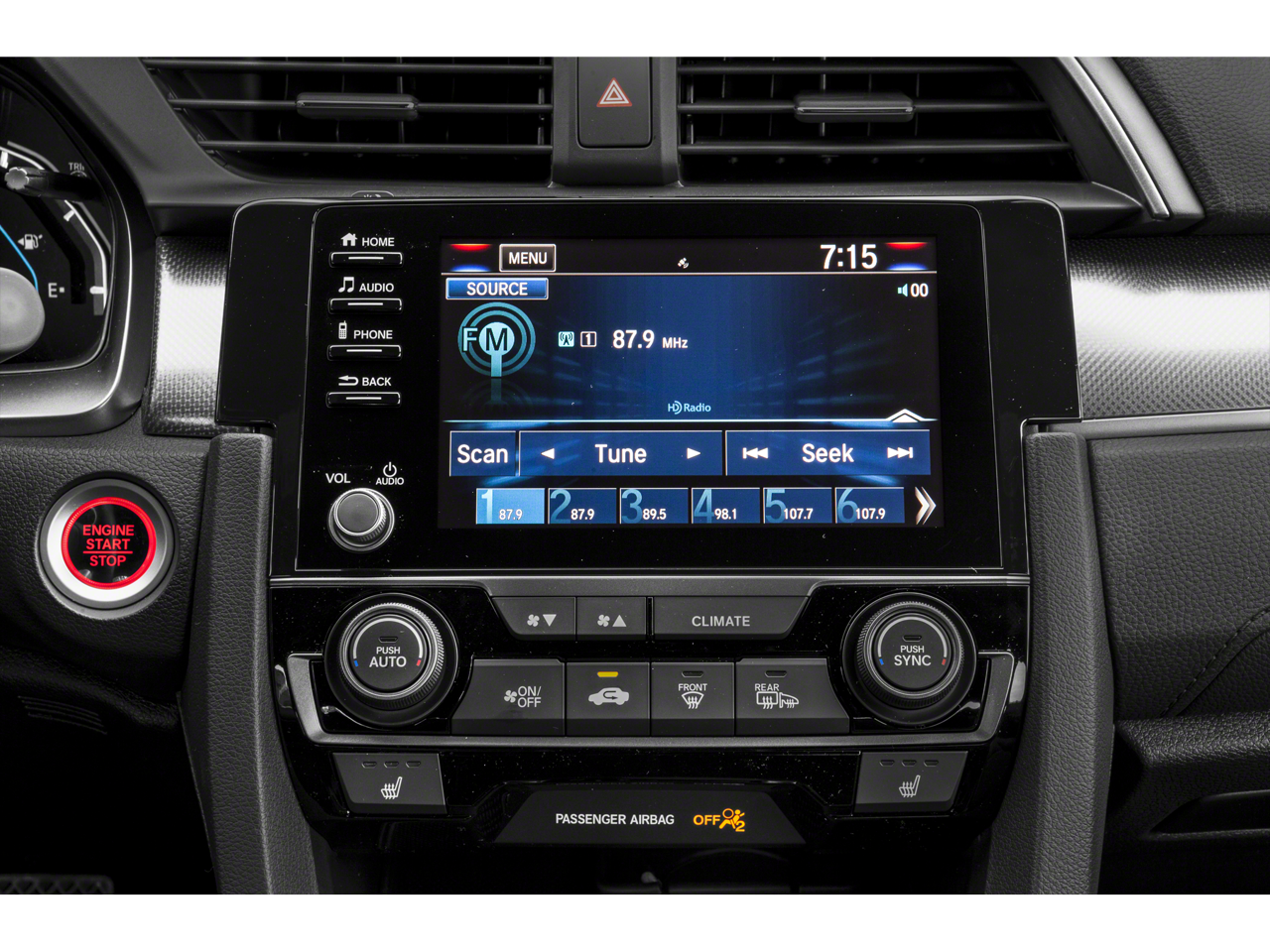 - Radio: 180-Watt HD Audio System -inc: 8 speakers, 7-inch display audio w/high-resolution electrostatic touch-screen, knob and hard keys for primary controls and customizable feature settings, Bluetooth® HandsFreeLink, Bluetooth® streaming audio, Radio Data System (RDS), speed-sensitive volume compensation (SVC), 1.5-amp USB smartphone/audio interface port in front console, 1.0-amp USB audio interface port in center console, HondaLink, Apple CarPlay integration, Android Auto integration, SiriusXM radio, SMS text message function, illuminated steering wheel-mounted controls and fin-type roof-mounted antenna