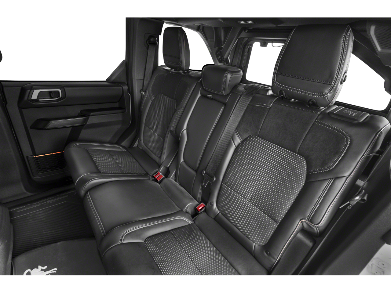 The Bronco Raptor's striking exterior features a bold, muscular design that commands attention. The Gray exterior, complemented by the Code Orange accent seat belts, creates a truly unique and eye-catching appearance. Step inside and you'll be greeted by the luxurious Black Onyx, Leather-Trimmed/Vinyl Bucket Seats, providing both comfort and style.