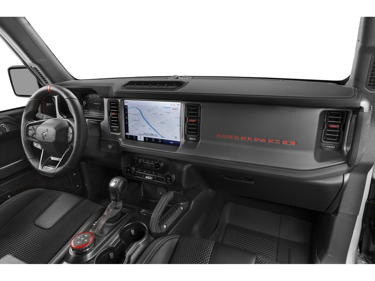 This Bronco Raptor is equipped with the Equipment Group 374A Lux Package, which includes a host of premium features such as the B&O Sound System, Connected Built-In Navigation, Heated Steering Wheel, and Wireless Charging Pad. The Interior Carbon Fiber Pack 6 and Front Row Top Panels & Door Storage Bags add an extra touch of refinement and convenience.